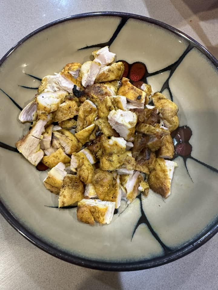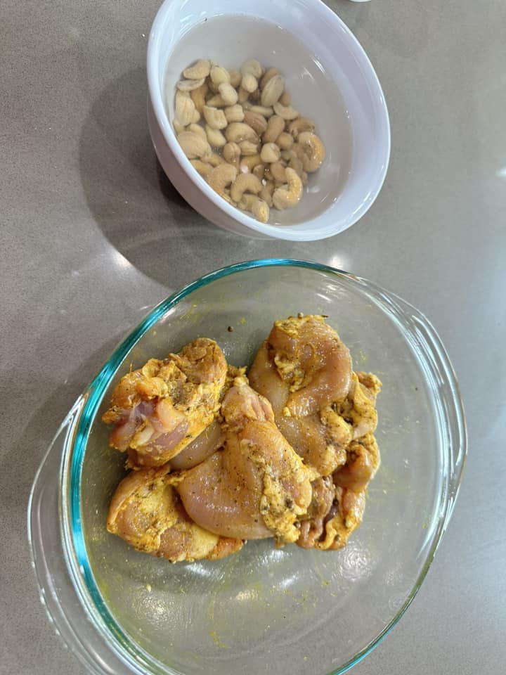 - Step 3: While your cashews are soaking, you can marinate your chicken: in a large bowl add chicken, olive oil, cumin, coriander, turmeric, garlic powder, oregano, cayenne, salt and pepper. Toss together to coat the chicken and allow it to marinate for 30 minutes-1 hour, or up to 24 hours.